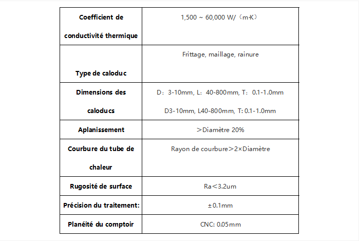 1、Choix du tube de chaleur : Les tubes de chaleur avec différentes structures capillaires ont des performances de transfert de chaleur variées. Dans les applications réelles, des procédés de formage tels que le pliage et le aplatissement doivent être effectués pour répondre à différents besoins de dissipation thermique. De plus, le diamètre, la longueur et la direction d'assemblage du tube de chaleur influencent également ses performances de transfert de chaleur.